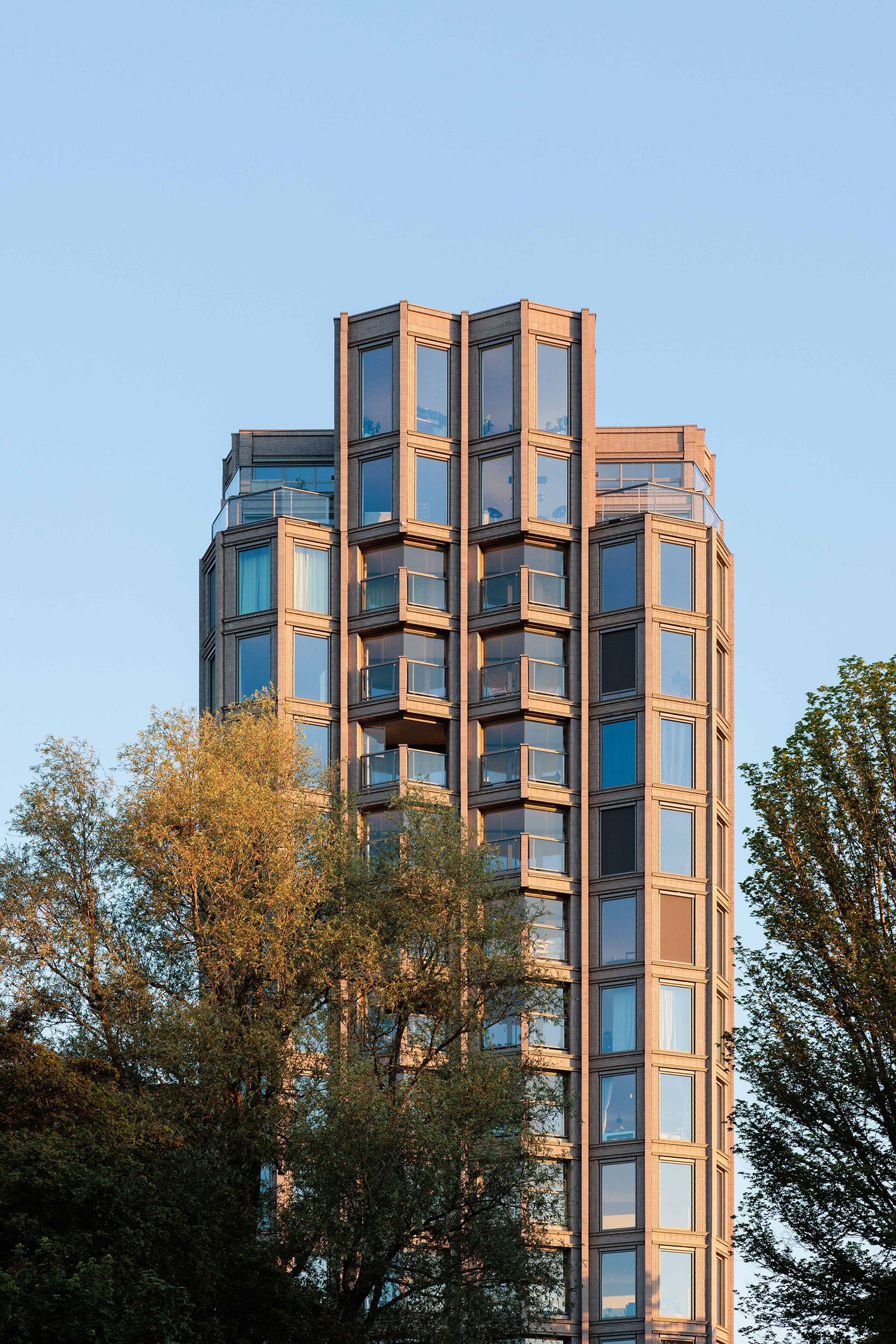 Op de hoeken van de kopse zijde van de top springt de gevel trapsgewijs terug, waardoor een duidelijke kroon ontstaat. In de plint zijn de entrees benadrukt met hoge glazen uitsparingen in de hoeken van de bakstenen gevel.